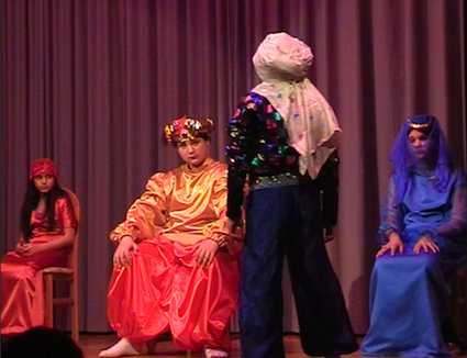 in der Menge, als eine Sänfte, in der Fatima sitzt, von links auf die Bühne getragen